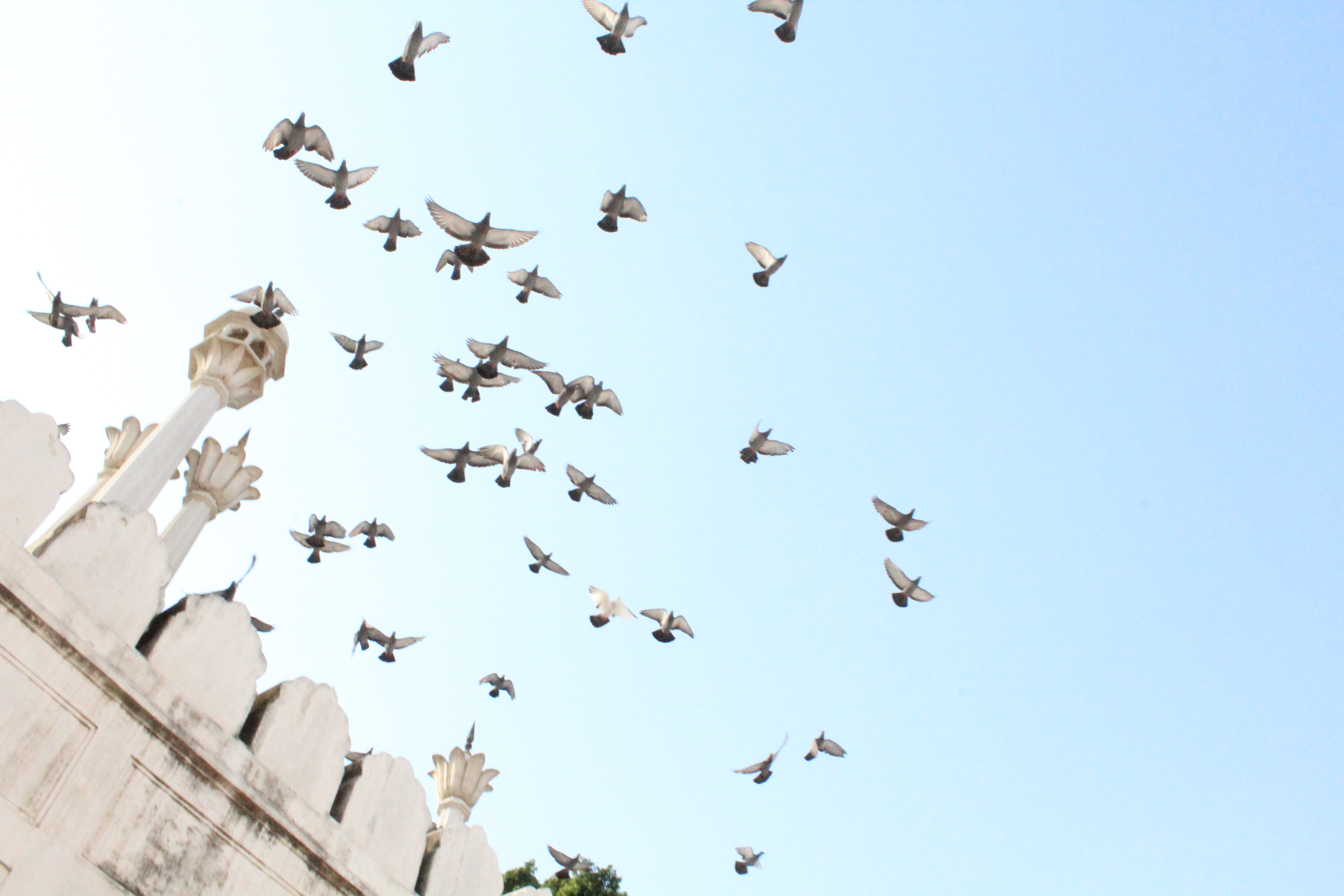 Pigeons fly over the mosque inside the Red Fort, Delhi