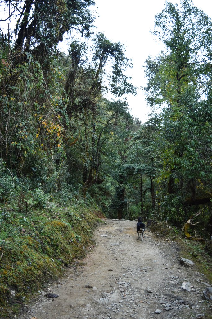 But she is right. Soon the steps give way to muddy trails. The proper trekking trail at last. A canned dog from somewhere joins us and leads the way through the greenish forest. The black dog has so much more stamina even with its crooked leg. Every time we take rest he keeps coming back to us as if urging us to move on “Dogs are the most loyal thing in the world” “He is not being loyal, he is just scared to go alone” I argued with Adi. Anyway I am very happy to get a local company through the forest which is now getting darker every minute. It is almost certain that we two are the only two living souls on this route now. Apart from the dog of course. It seems we haven’t learned anything from the last night. And it becomes obvious when Adi sprains his ankle. The cell phone flash light isn’t sufficient enough on a path covered with pebbles and rocks. Our companion is now nowhere in sight. It just occurred to us that we haven’t seen any civilization after passing Ulleri.  It is we who are scared not the dog!