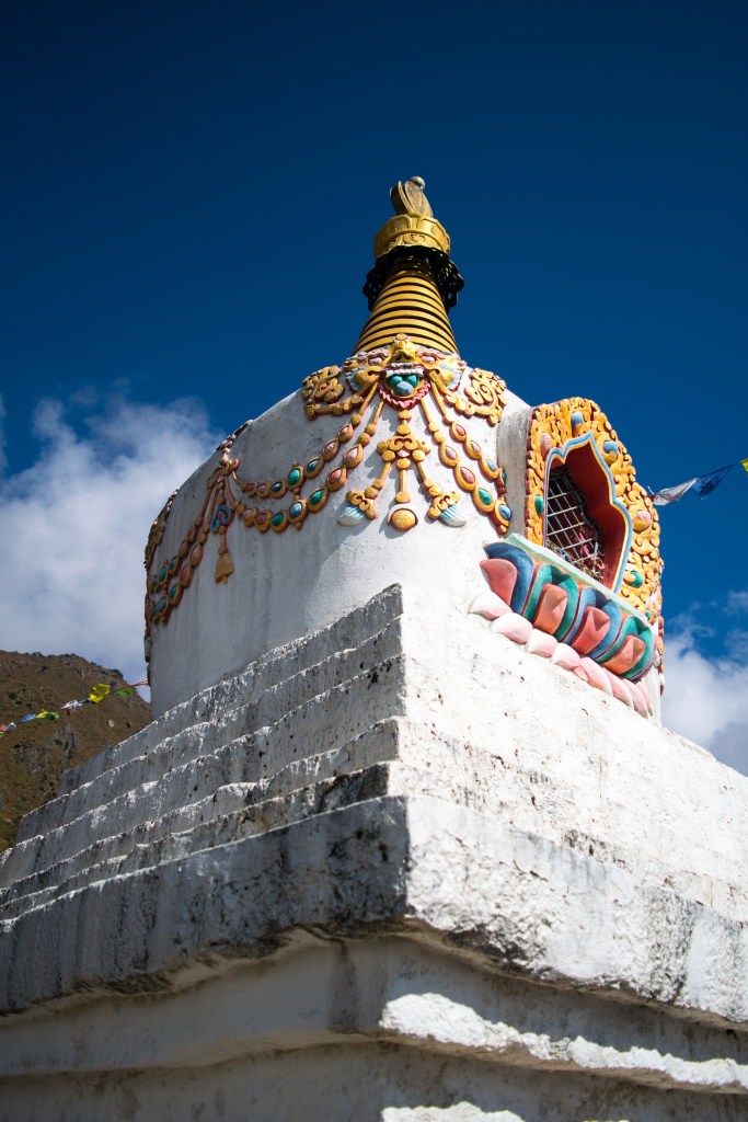 Like the previous day it is Ama Dablam which dominates the landscape on the way. This is not the right moment to absorb her beauty as the scorching rays of noon reflecting back from the ice glaciers on the top, makes it hard to get a good look at it. Back in the days, the tall peak with long ridges on its either sides had reminded someone of Ama (mother) and the ice on top of it as Dablam (necklace). Mothers’ necklace – couldn’t coin a better name.
