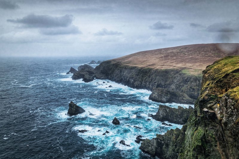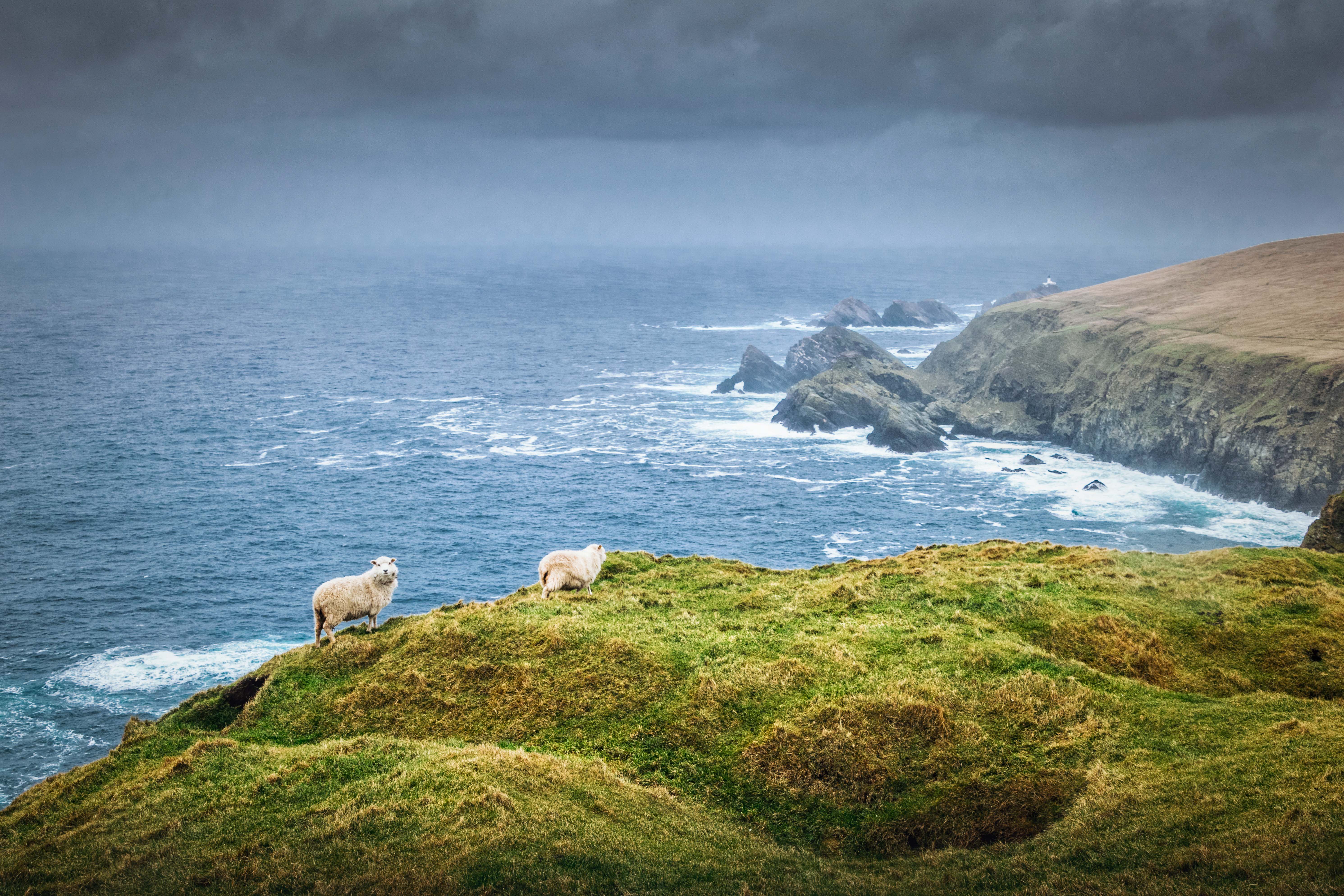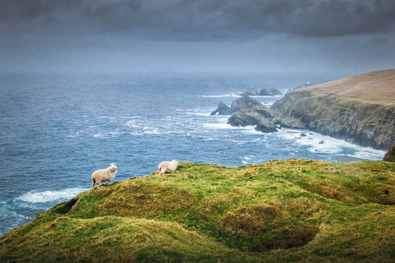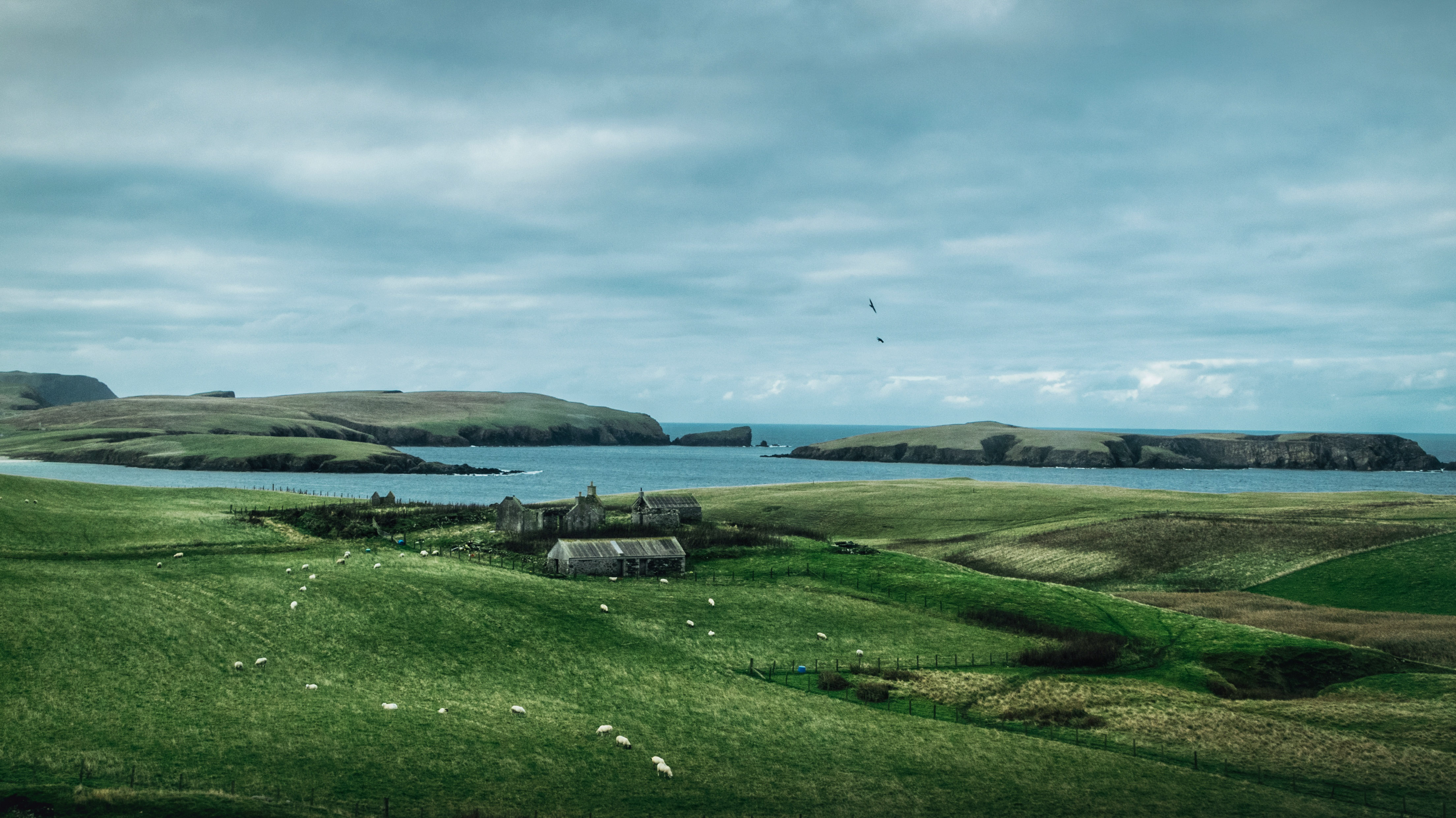 I drop my backpack and sit on the wet grass, laughing away, delighted by the spectacular view in front of me. Huge waves, relentless, pounding the rocky bottom. Sea birds aimlessly glide over before tiring and returning to their small caverns on the sides of the cliffs. At the far end, clouds and the ocean fused together, making it difficult to identify the horizon. The wind is not harsh yet still annoying, the drizzle not so cold yet very sulky; a perfect day in Shetland… On the steep edges some sheep stand, eating fresh grass. Startled by an unexpected visitor they suddenly lookup. I look around. No signs of a human soul.