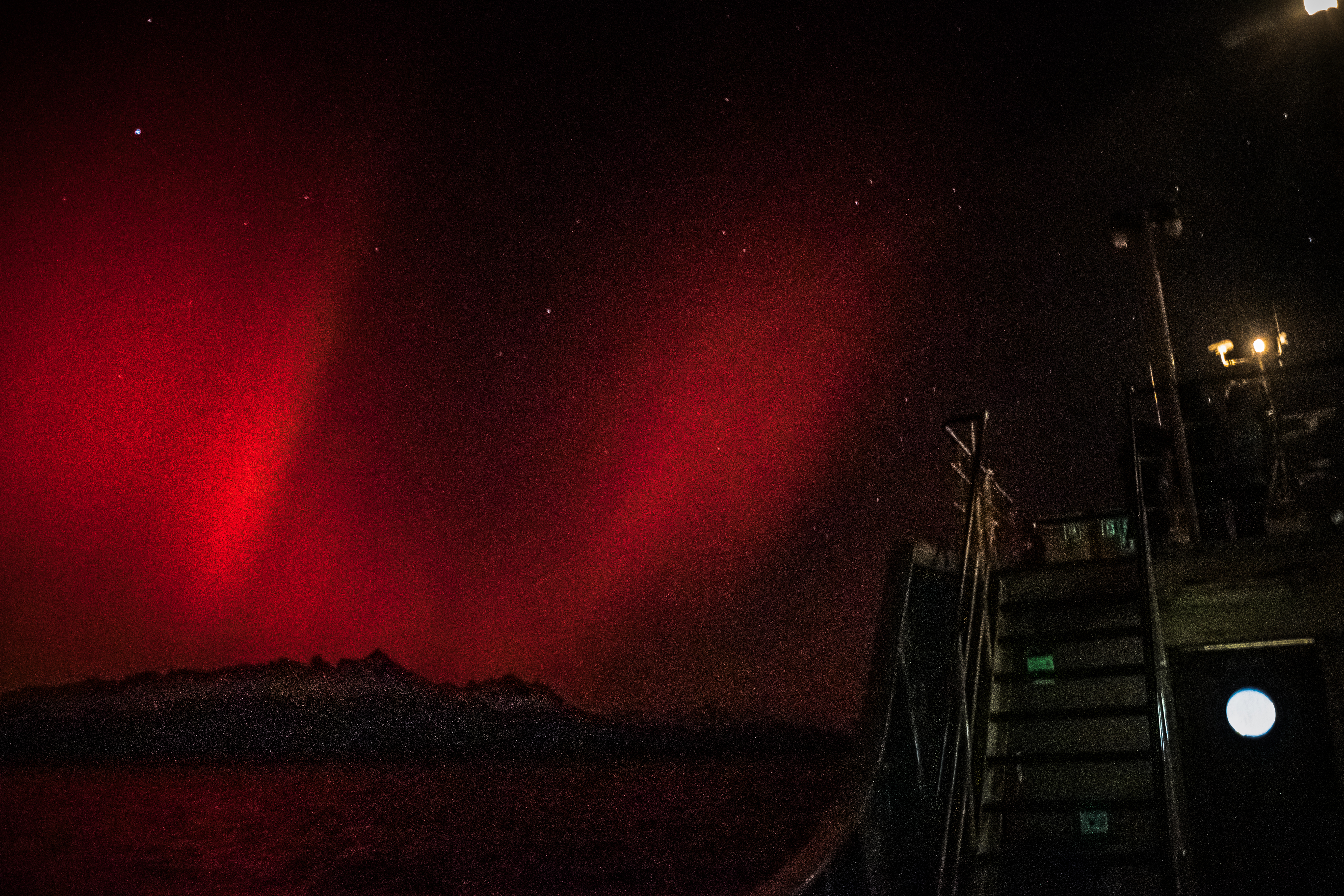 I blink and look again, my heart racing. I’m seeing the southern lights! Aurora Australis. All my life, I’ve heard about the Northern Lights, but I’d forgotten they existed here too, on the opposite pole. I dash back into the cabin, layering up as quickly as I can, and the students join me, their jaws dropping in awe at the strange, magnificent red sky. The fact that they’re from Punta Arenas and seeing this for the first time tells me how rare this moment truly is. Have I gotten incredibly lucky?