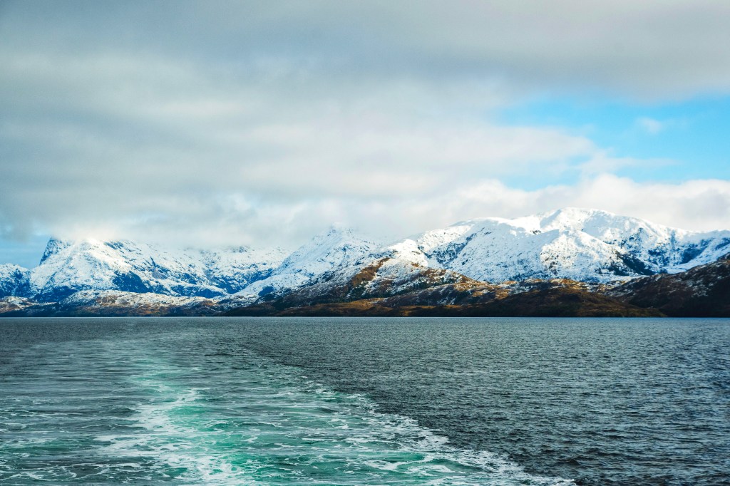 The terrain has changed dramatically since we left Punta Arenas. To the left, there are the familiar snowy mountains, their peaks draped in white, just as I had expected. But the greenish landscape on the other side baffles me. It’s alive with tall waterfalls cascading down cliffs, vibrant and unexpected. How can a place like this exist here, after all only Antarctica lies beyond? The mysteries of nature never cease to amaze me. As more light filters through the overcast sky, the landscape reveals even more of its breathtaking beauty.